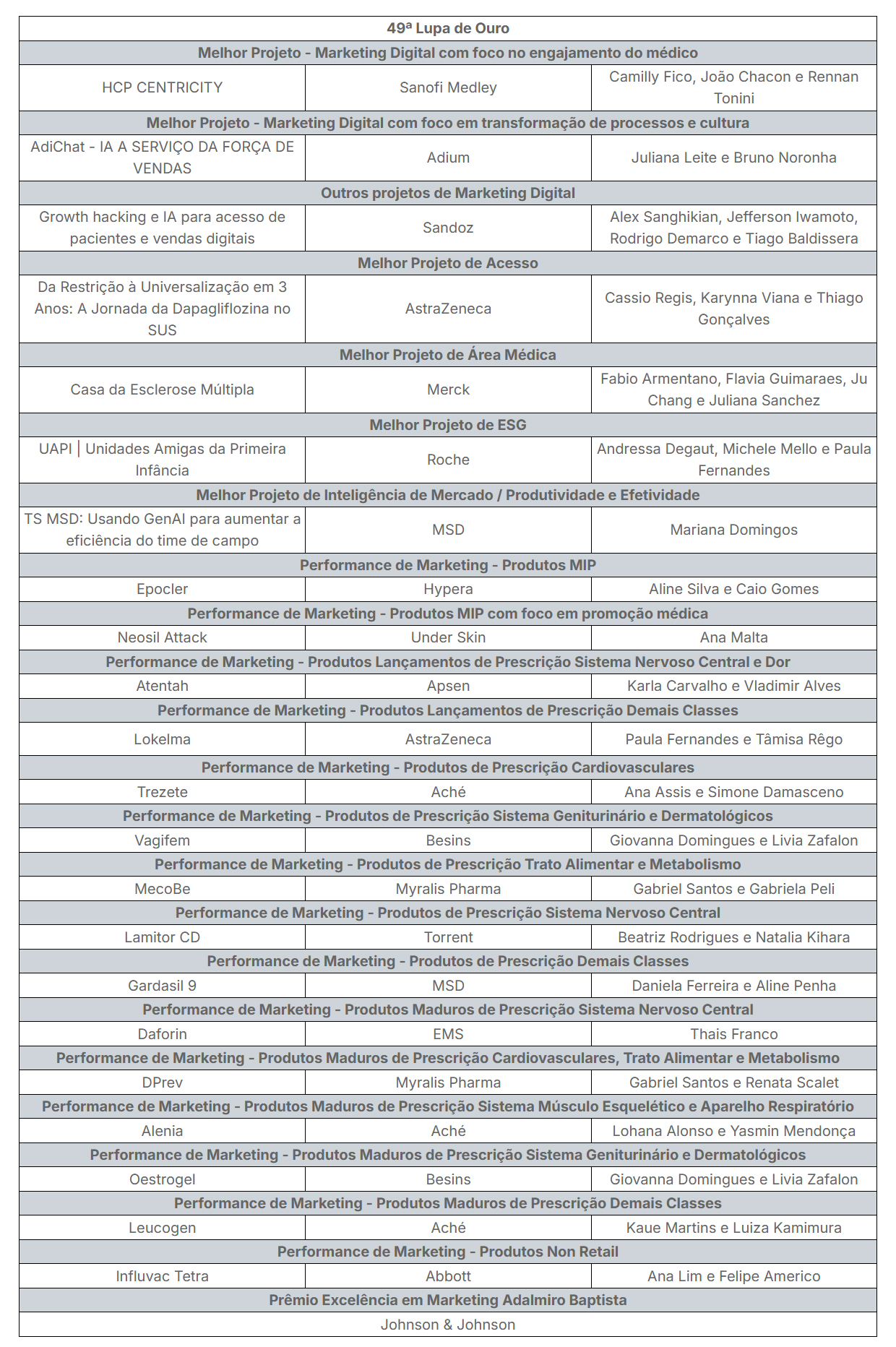 A 49ª edição do Prêmio Lupa de Ouro, promovido pelo Sindicato da Indústria de Produtos Farmacêuticos (Sindusfarma), registrou um recorde histórico de 510 projetos inscritos por 65 empresas. O anúncio dos 25 vencedores nas categorias de Marketing, Acesso e ESG foi realizado na noite de 13 de novembro, no Tokio Marine Hall, em São Paulo, após a avaliação de 71 campanhas finalistas por um júri de 55 executivos da indústria farmacêutica.